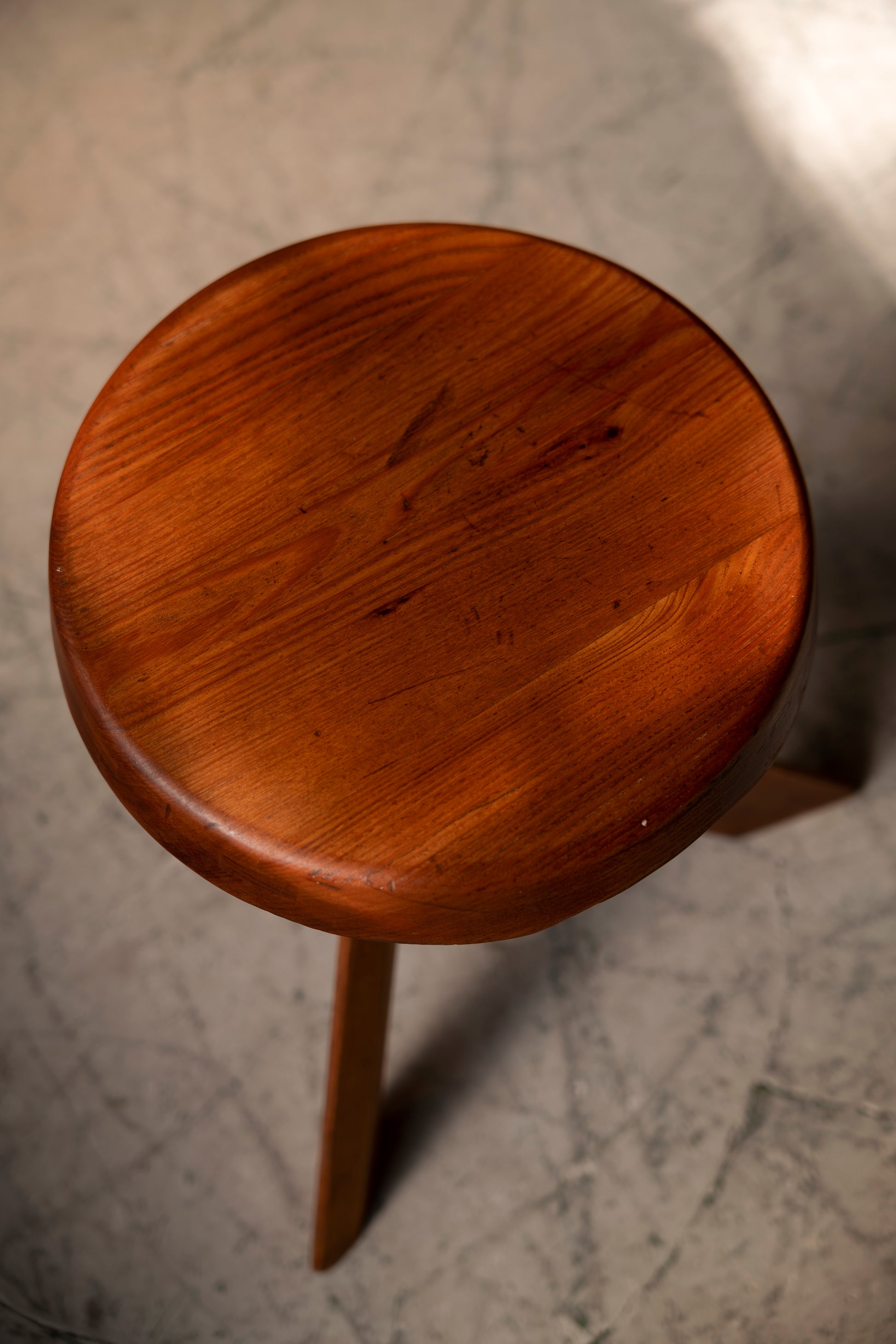 S31 は、1974年にピエール・シャポがデザインしたスツールシリーズの第2弾として発表されました。このスツールの最大の特徴は、3 本の脚が収束するように組み合わされ、小さな座面に人の体重が掛かっても、しっかりと安定するベースの構造にあります。この技術的な挑戦は、スツールの美しさを高めると共に、木工芸の技術とモダンデザインを融合させた当時としては前衛的なデザインとなりました。頑丈で粘りがある上質なエルム材で作られています。ヴィンテージの個体となります。